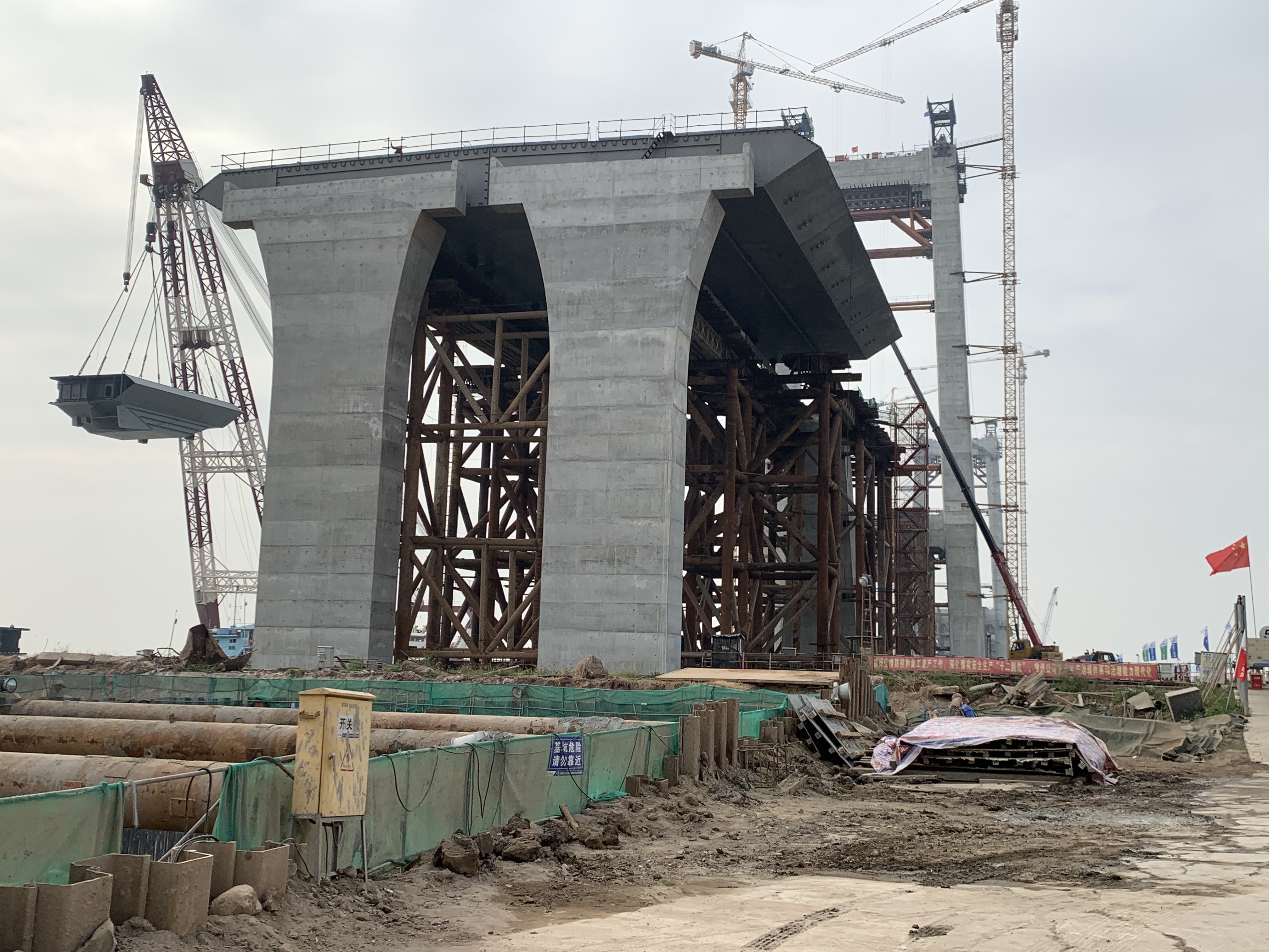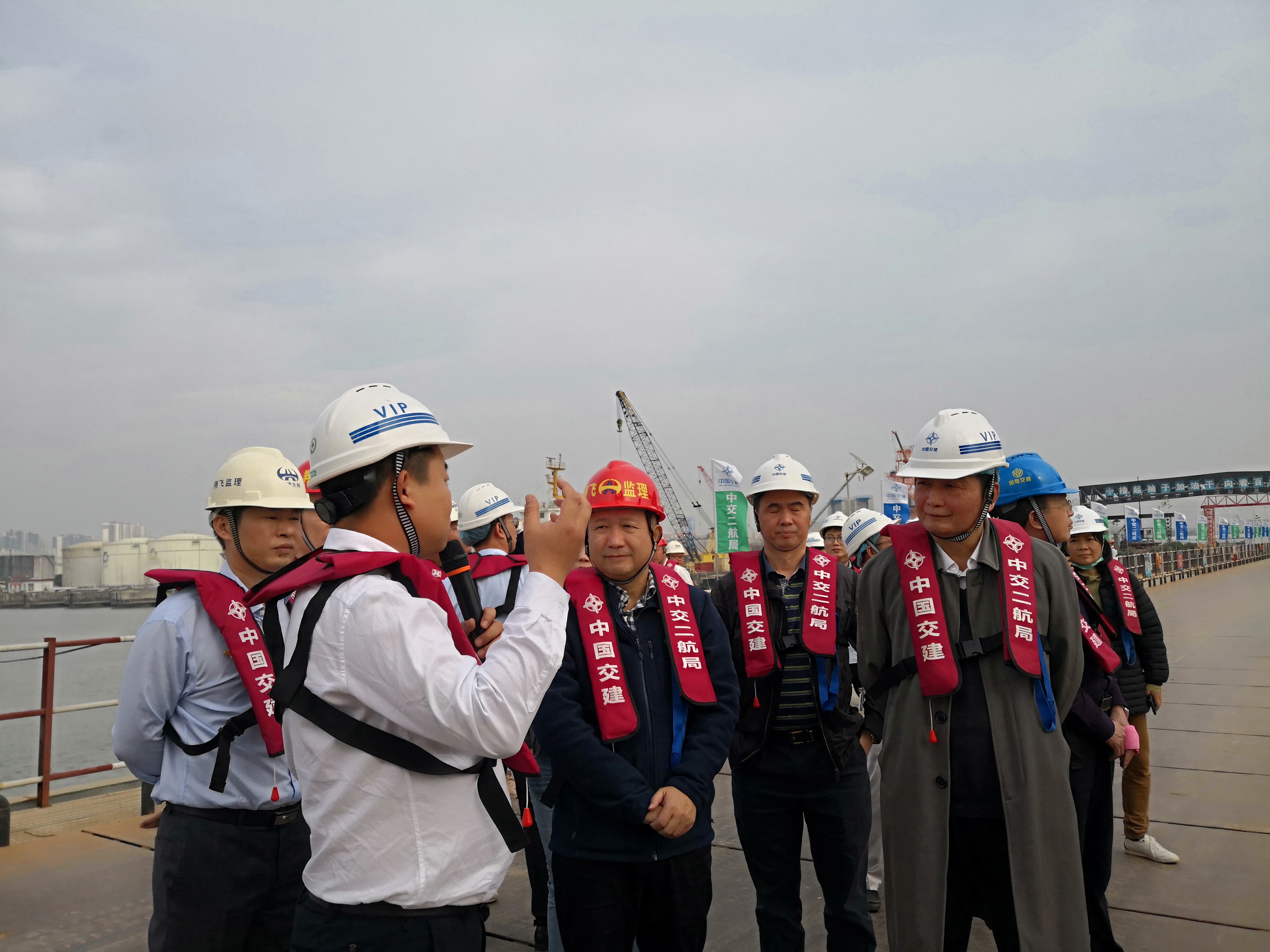 首先,大家前往東江南支流港灣大橋項目地進行參觀學習。通過中交二航局項目經理游川的詳細講解,我們了解到本項目主橋為主跨320m的自錨式懸索橋,跨度居國內前列,首次采用“臨時錨碇法”進行主橋上部結構“先纜后梁”施工,解決了自錨式懸索橋“先纜后梁”施工的諸多技術難題,為我國橋梁工程施工建設提供了重要理論依據和實用技術。作為項目監(jiān)理方,我們的監(jiān)理技術和手段隨著施工工藝的更新而不斷迭代升級,為項目建設質量保駕護航?!耙粯蝻w架南北,天塹變通途”,作為項目建設者,我們倍感驕傲!