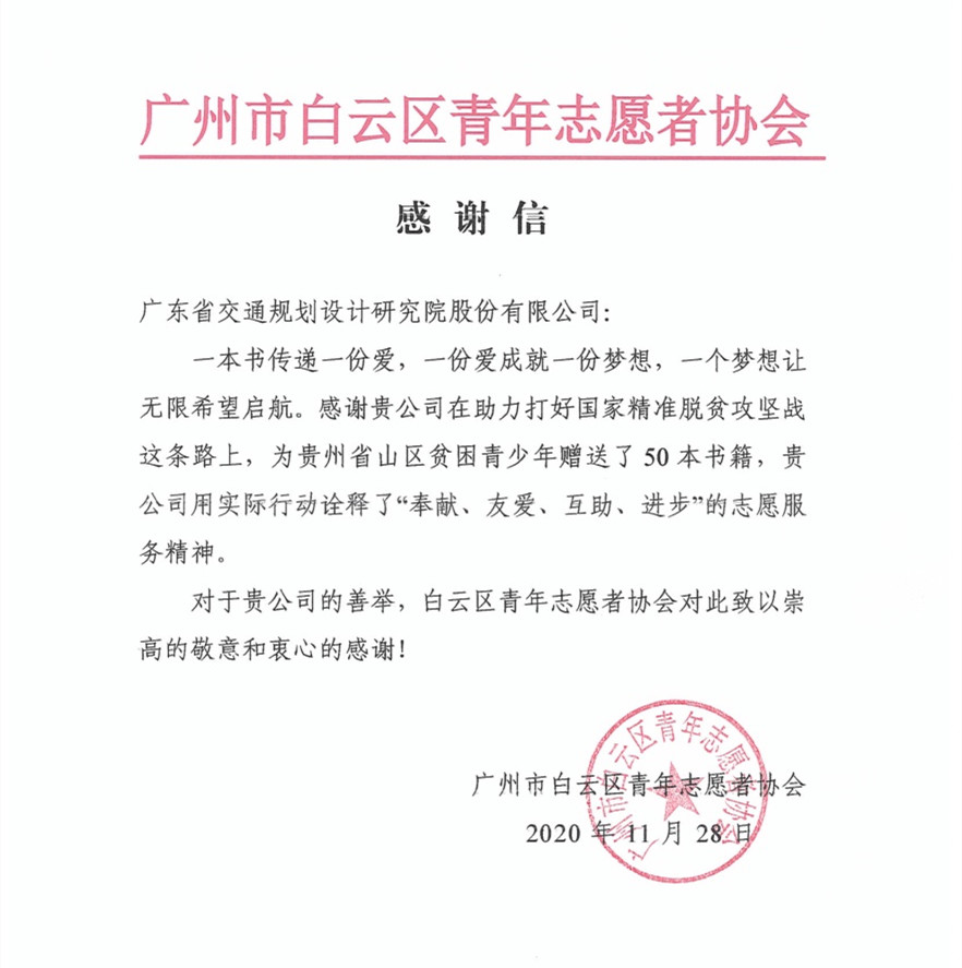 一本書傳遞一份愛(ài),一份愛(ài)成就一份夢(mèng)想,一個(gè)夢(mèng)想讓無(wú)限希望啟航。2020年,公司第十二黨支部積極參與廣州市白云區(qū)青年志愿者協(xié)會(huì)向貴州省山區(qū)貧困青少年贈(zèng)書活動(dòng),組織支部黨員自發(fā)捐贈(zèng)少兒讀物,用實(shí)際行動(dòng)踐行公司“至誠(chéng)至善,求實(shí)創(chuàng)新”的核心價(jià)值觀,同時(shí)也得到了廣州市白云區(qū)青年志愿者協(xié)會(huì)的認(rèn)可,并收到協(xié)會(huì)的感謝信。