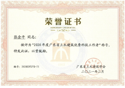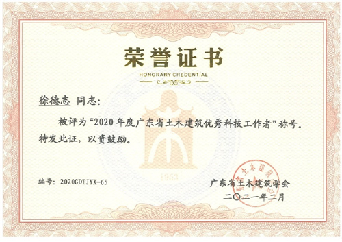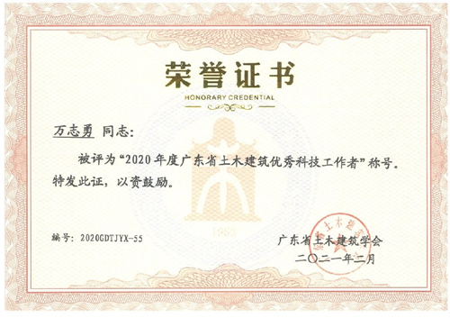 近日,公司被廣東省土木建筑學(xué)會授予“2020年度廣東省土木建筑科技創(chuàng)新先進企業(yè)”榮譽稱號;公司副總工程師梁志勇和萬志勇、巖土勘察院院長張金平、第四設(shè)計院總工程師徐德志4人被評為“2020年度廣東省土木建筑優(yōu)秀科技工作者”。特此報喜。