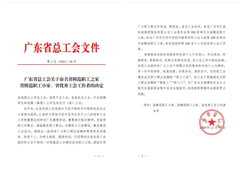 近日,從廣東省總工會傳來喜訊,我公司榮獲“廣東省模范職工之家”稱號。這是集團(tuán)公司首次獲得該項榮譽(yù),是對集團(tuán)公司工會圍繞中心,服務(wù)大局,切實做好職工“娘家人”、“貼心人”的肯定,特此報喜!