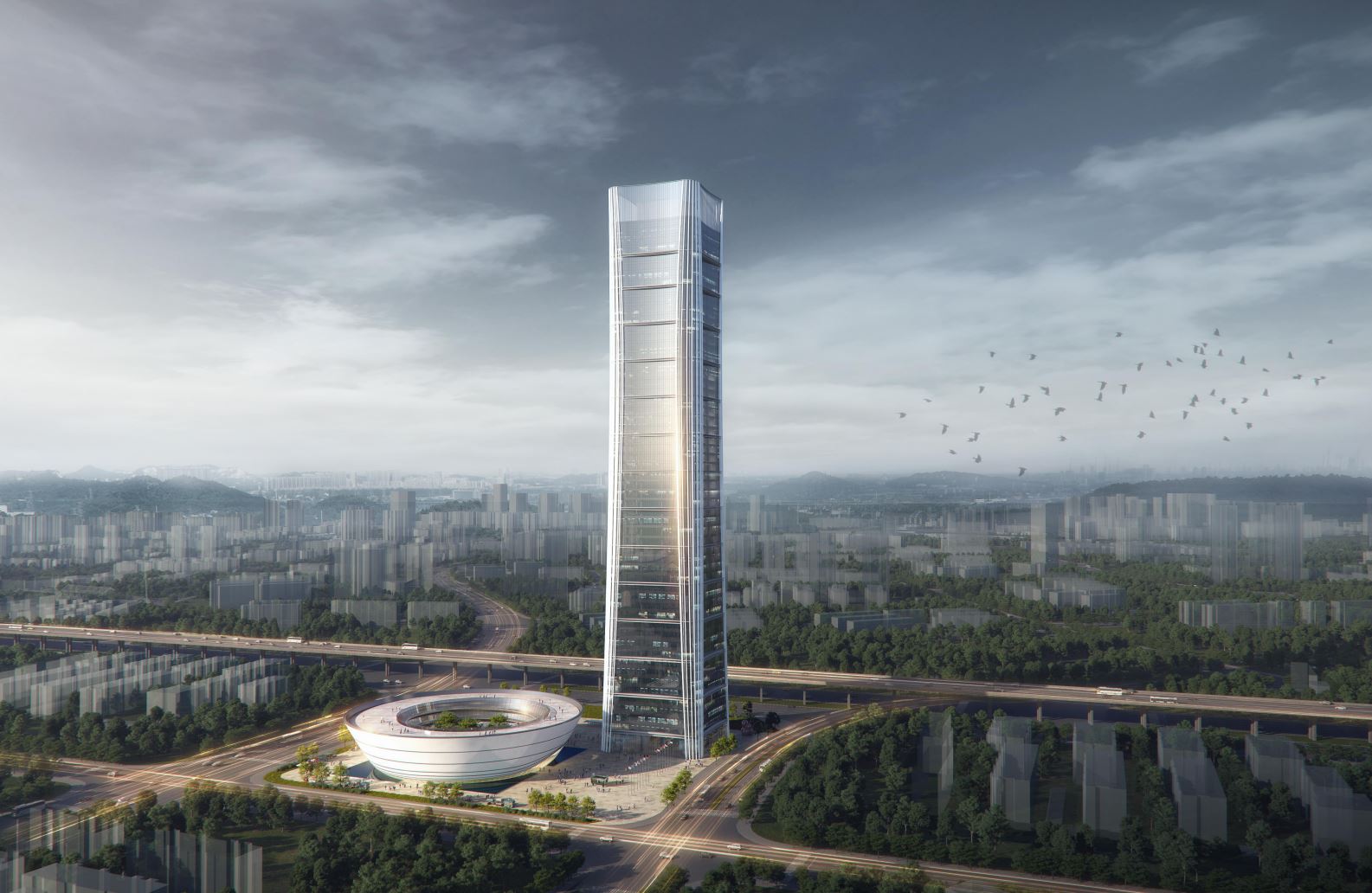 “灣區(qū)之源”方案以“天下萬物生于有,有生于無”為設計主題,由塔樓和裙樓兩部分組成,長短相形,高下相傾,前后相隨。塔樓功能以辦公和商住為主,外立面造型靈感來自竹節(jié),象征“生生不息,堅韌不拔”;裙樓平面布置可塑性強,可滿足會議、會展、商演等多功能需求,形似容器,通體渾圓,寓意“包容并蓄,有容乃大”。同時,方案圍繞“綠色、環(huán)?!边M行了多項創(chuàng)新設計。