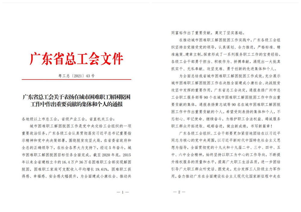 12月20日,廣東省總工會(huì)以電視電話會(huì)議形式召開了全省城市困難職工解困脫困工作總結(jié)表彰會(huì)。會(huì)議總結(jié)了五年來(lái)全省各級(jí)工會(huì)推進(jìn)城市困難職工解困脫困工作取得的重大成就,并表?yè)P(yáng)了一批在工作中真抓實(shí)干、無(wú)私奉獻(xiàn)、攻堅(jiān)克難、勇于創(chuàng)新的先進(jìn)集體和個(gè)人。我公司被省總工會(huì)授予“在城市困難職工解困脫困工作中作出重要貢獻(xiàn)集體”榮譽(yù)稱號(hào)!