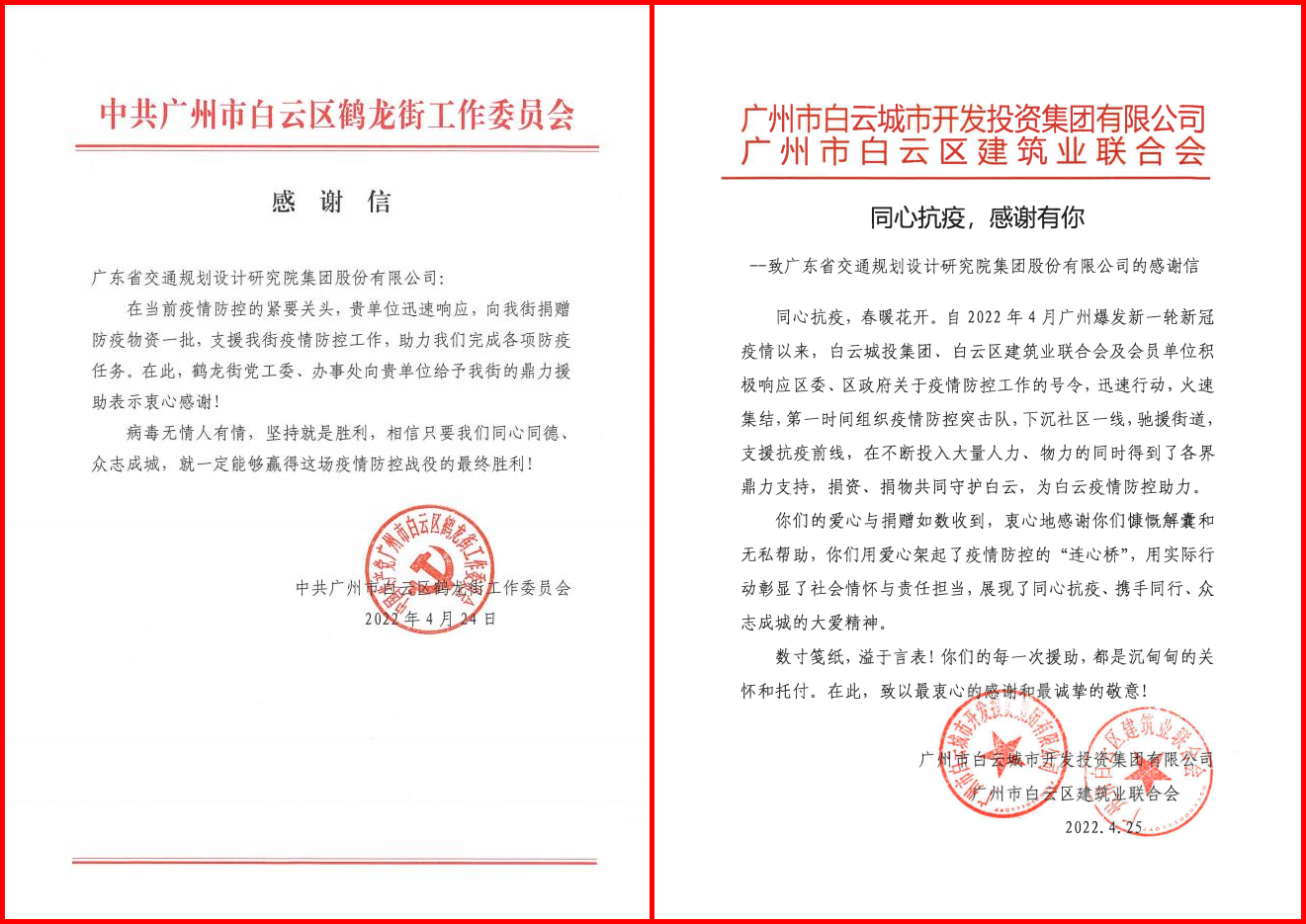 集團收到白云區(qū)鶴龍街黨工委、白云城投集團感謝信