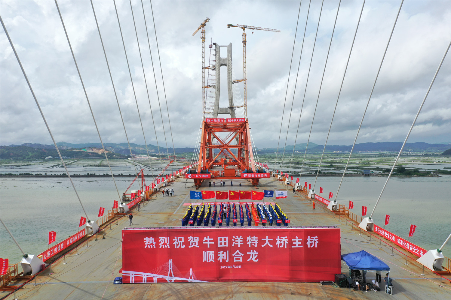 6月30日上午10時08分,合龍總指揮一聲令下,隨著最后一節(jié)鋼桁梁與兩邊鋼桁梁的精準連接,牛田洋特大橋成功合龍。