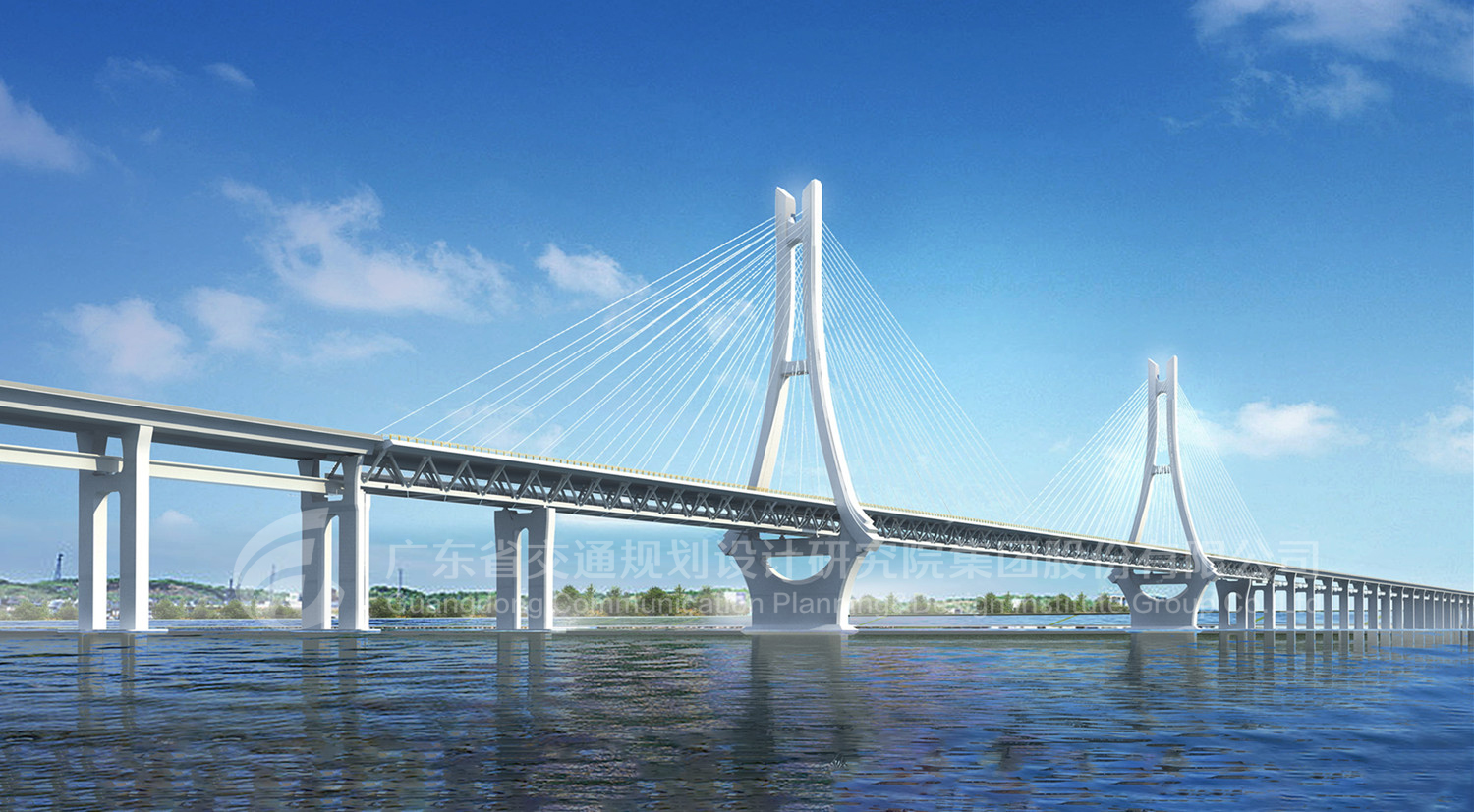 該橋景觀要求高、建設條件復雜。集團針對景觀、抗風、抗震、防腐、防撞及車橋耦合、鋼桁梁斜拉橋設計關(guān)鍵技術(shù)等開展了科研攻關(guān),確定最優(yōu)結(jié)構(gòu)方案及關(guān)鍵技術(shù)參數(shù),確保大橋安全可靠、經(jīng)濟耐久、技術(shù)先進、造型優(yōu)美。