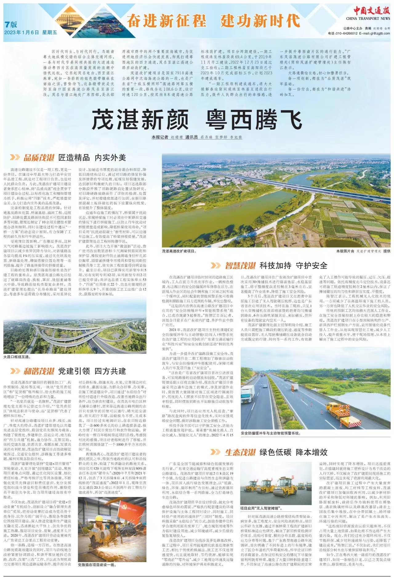 《中國(guó)交通報(bào)》(第7889期第7版)以“茂湛新顏,粵西騰飛”為題,從品質(zhì)、和諧、智慧、生態(tài)四個(gè)角度報(bào)道了茂湛高速改擴(kuò)建項(xiàng)目打造優(yōu)質(zhì)擴(kuò)建品牌。