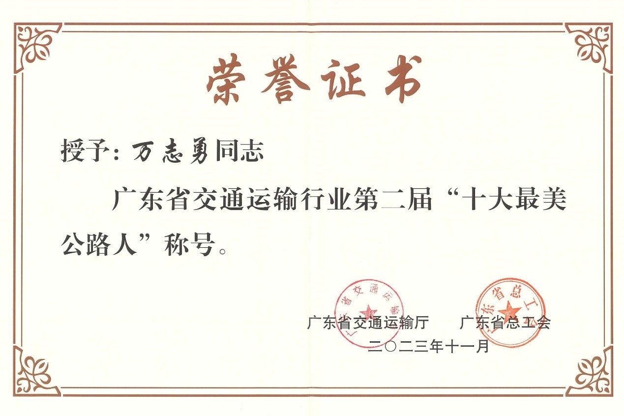 為大力弘揚新時代交通精神,展示中國式現(xiàn)代化開路先鋒的良好風采,發(fā)掘宣傳公路交通行業(yè)“最美”典型,加快建設交通強國先行示范省,近期廣東省交通運輸廳、省總工會聯(lián)合組織開展了第二屆“最美公路人”推選宣傳活動,公司副總工程師萬志勇喜獲廣東省交通運輸廳授予“廣東交通運輸系統(tǒng)第二屆‘十大最美公路人’”榮譽稱號。