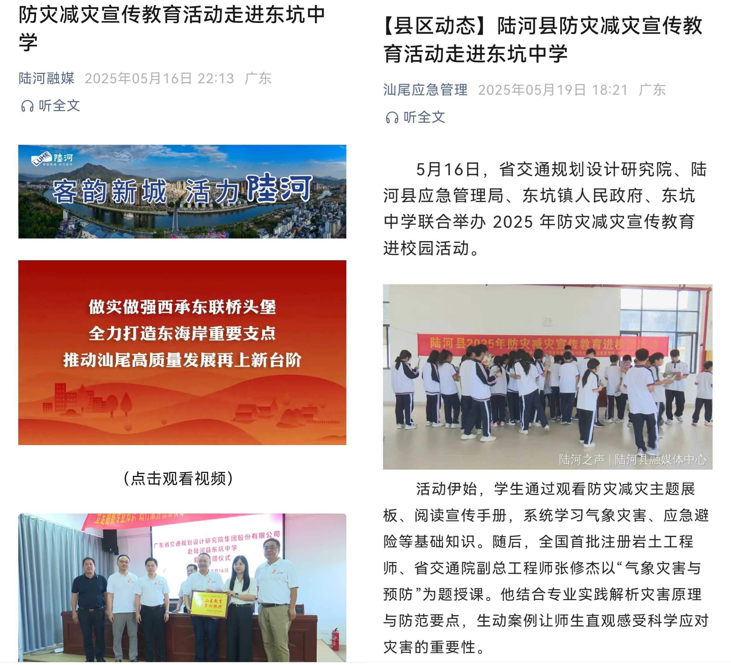 2025年5月12日是第17個(gè)全國(guó)防災(zāi)減災(zāi)日,今年的主題是“人人講安全、個(gè)個(gè)會(huì)應(yīng)急——排查身邊災(zāi)害隱患”,5月12日至18日為防災(zāi)減災(zāi)宣傳周。為深入貫徹落實(shí)習(xí)近平總書(shū)記關(guān)于防災(zāi)減災(zāi)救災(zāi)重要論述精神及黨中央、國(guó)務(wù)院決策部署,切實(shí)推動(dòng)防災(zāi)減災(zāi)科普宣教工作走深走實(shí),5月16日下午,由公司黨委委員、紀(jì)委書(shū)記、副總經(jīng)理田可耕和工程勘察院組成的第八黨支部聯(lián)合由公司總工程師孫向東、總工程師辦公室、科技質(zhì)量部、財(cái)務(wù)管理部、董事會(huì)辦公室、綜合管理辦公室組成的第十二黨支部開(kāi)展支部共建活動(dòng),赴陸河縣東坑中學(xué)開(kāi)展防災(zāi)減災(zāi)主題科普宣傳活動(dòng),用實(shí)際行動(dòng)踐行社會(huì)責(zé)任,為基層防災(zāi)減災(zāi)建設(shè)添磚加瓦。