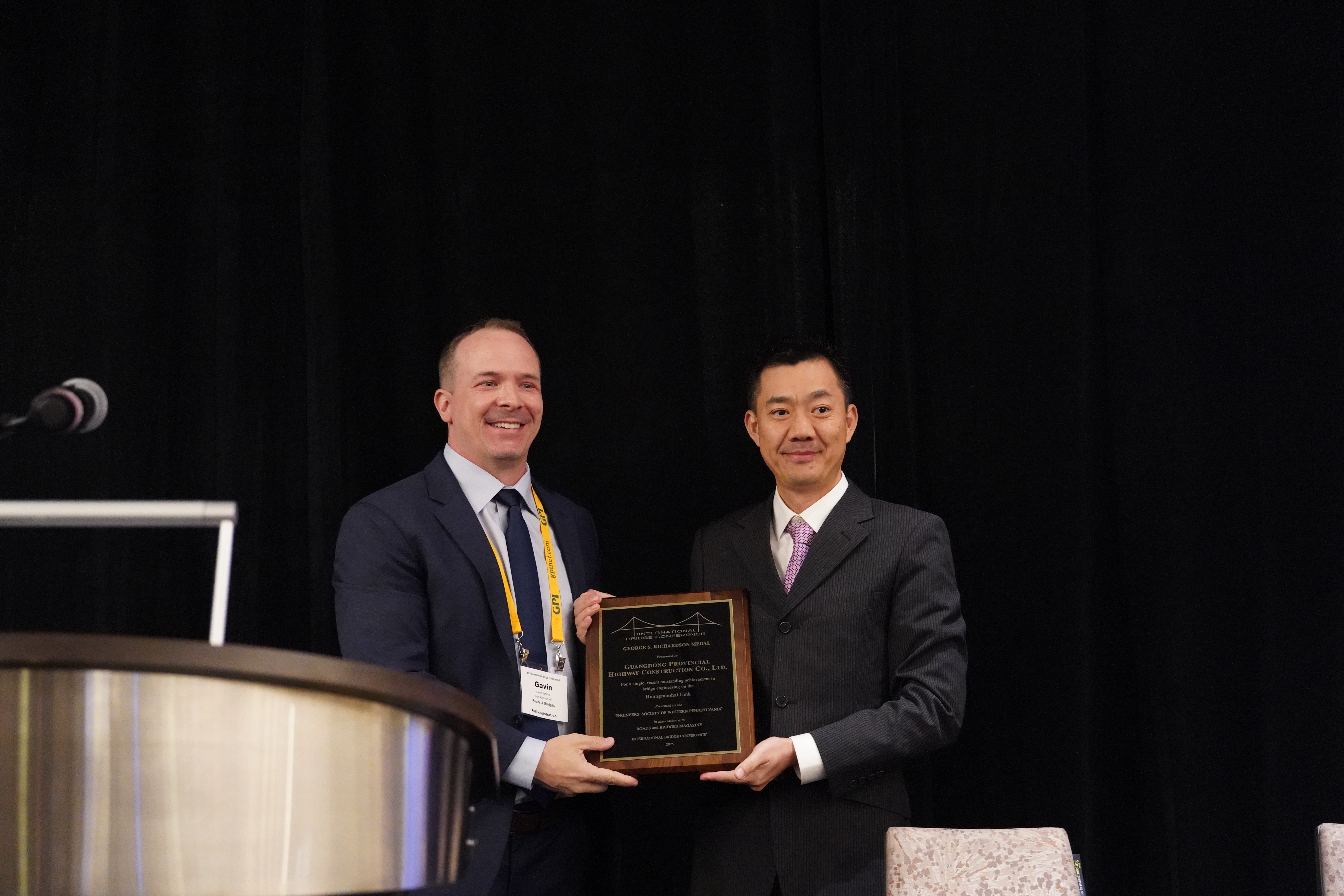 近日,公司承擔(dān)的黃茅海跨海通道項(xiàng)目榮獲2025年喬治?理查德森獎(GeorgeS.Richardson Medal),成為本屆我國唯一獲此殊榮的項(xiàng)目。作為獲獎單位,公司受邀參加了2025年7月14日-16日(美國當(dāng)?shù)貢r間)在賓夕法尼亞匹茲堡舉行的第42屆國際橋梁大會(International Bridge Conference,簡稱IBC),公司第四設(shè)計(jì)院總工程師徐德志作為公司代表參加了大會并領(lǐng)取了獎項(xiàng)。