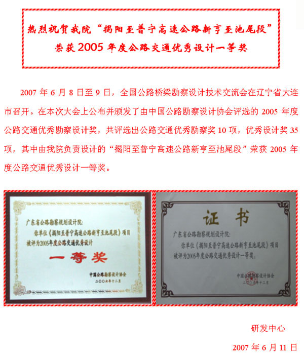 我院“揭陽至普寧高速公路新亨至池尾段”獲05年度公路交通優(yōu)秀設(shè)計一等獎