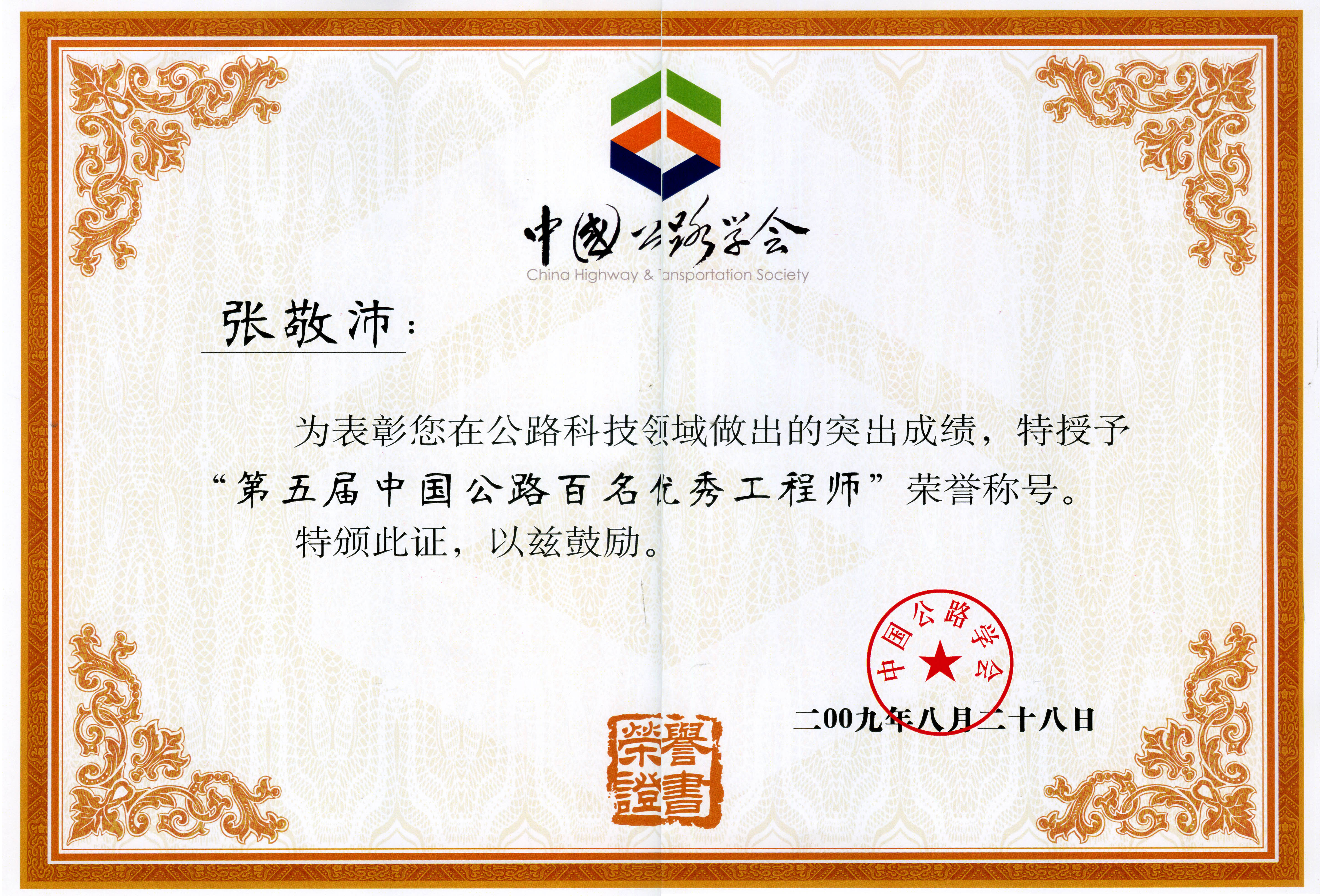 經(jīng)中國公路學(xué)會(huì)評(píng)審,我公司張敬沛副總工程師被授予“第五屆中國公路百名優(yōu)秀工程師”榮譽(yù)稱號(hào),特此報(bào)喜。