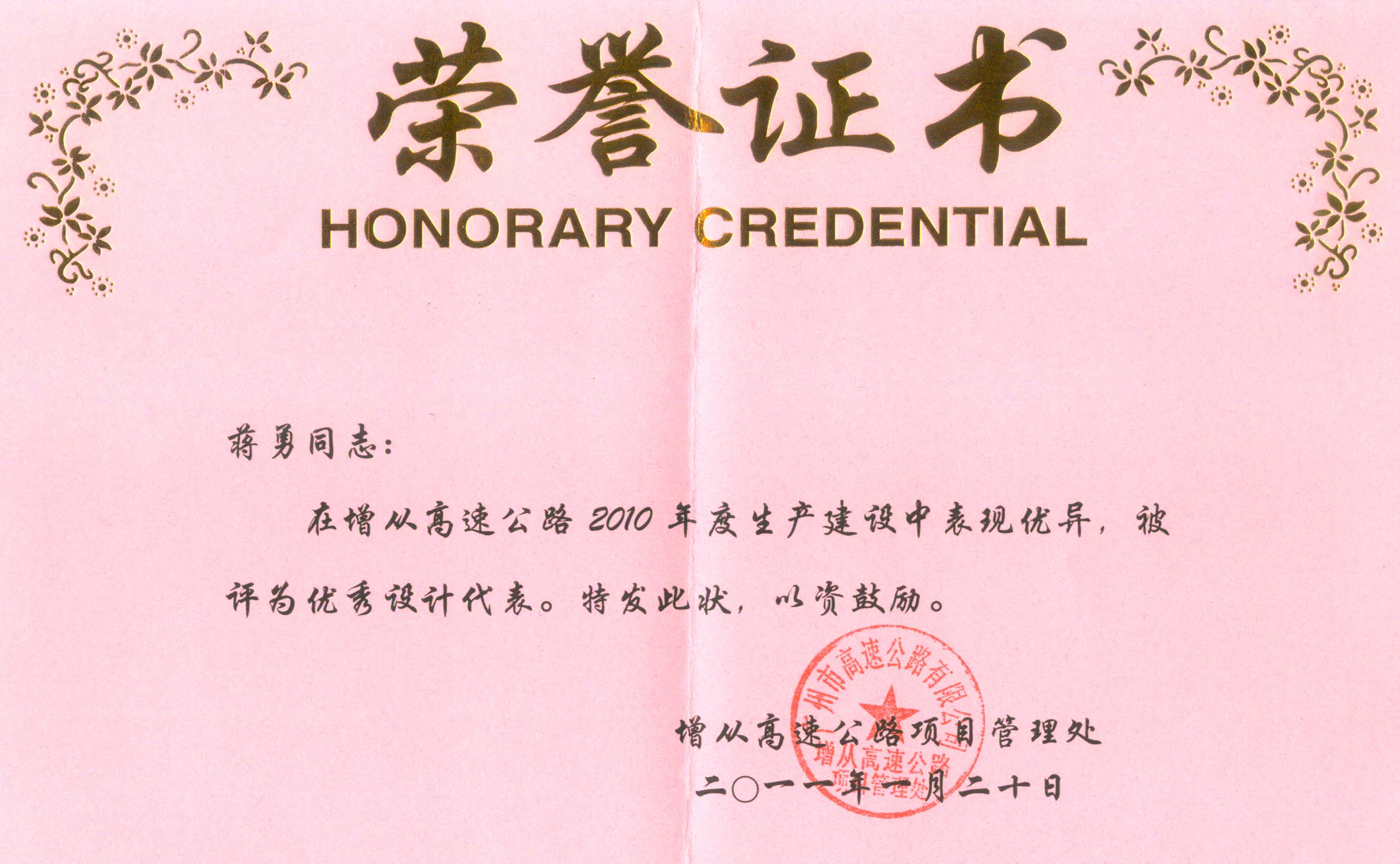 我司第四路橋設(shè)計部蔣勇同志在增從高速公路2010年度生產(chǎn)建設(shè)中表現(xiàn)優(yōu)異,被廣州市高速公路有限公司增從高速公路項目管理處評為“優(yōu)秀設(shè)計代表”,為公司樹立了良好的外部形象,贏得了榮譽,特此祝賀!
