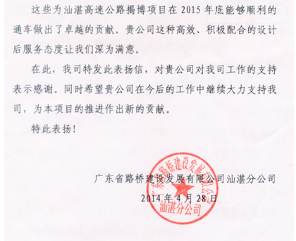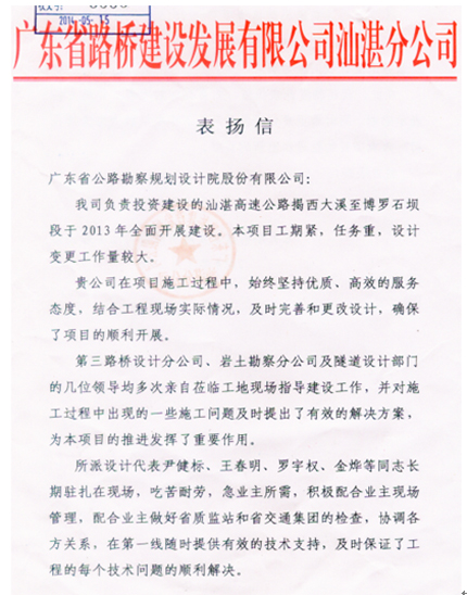 近日,省路橋建設(shè)發(fā)展有限公司汕湛分公司發(fā)來(lái)表?yè)P(yáng)信,對(duì)我司在汕湛高速公路揭西大溪至博羅石壩段項(xiàng)目中提供的優(yōu)質(zhì)、高效的設(shè)計(jì)后服務(wù)表示高度贊揚(yáng),對(duì)負(fù)責(zé)該項(xiàng)目的第三路橋設(shè)計(jì)分公司、巖土勘察分公司及隧道設(shè)計(jì)部,和尹健標(biāo)、王春明等一批設(shè)計(jì)代表的工作表示感謝。特此報(bào)喜。