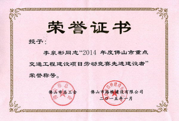 近日,我司第三路橋分公司駐廣明高速公路陳村至西樵段設(shè)計(jì)代表李泉彬同志受到佛山市總工會(huì)和佛山市路橋建設(shè)有限公司聯(lián)合表彰,榮獲2014年度“佛山市重點(diǎn)交通工程建設(shè)項(xiàng)目勞動(dòng)競(jìng)賽先進(jìn)建設(shè)者”稱(chēng)號(hào),李泉彬同志曾獲“先進(jìn)工作者”、“先進(jìn)建設(shè)者”稱(chēng)號(hào),為公司樹(shù)立了良好的外部形象,贏得了聲譽(yù),特表祝賀!