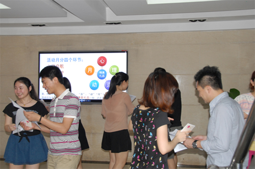 5月6日上午,公司在2號樓一樓大堂舉行了2015年“關(guān)注心靈,點燃激情”心理健康活動月啟動儀式。公司副總經(jīng)理、工會主席李琴,行政事務(wù)部工作人員和工會小組長參加了儀式。活動現(xiàn)場,小組長們?yōu)檫^往員工發(fā)放了心理自測問卷和母親節(jié)祝福卡。拿到問卷的小王下午向我們反饋:“我自測了其中3套問卷,覺得挺有意思的。在活動的參與過程中,我覺得自己在成長。這是一次很有意義的活動。” 本次活動為公司2015年“關(guān)注心靈,點燃激情”主題文化實踐活動的內(nèi)容之一,在公司尚屬首次,活動旨在引導(dǎo)職工關(guān)注心靈,增強心理健康意識?;顒庸卜帧靶撵`啟航”、“心靈理療”、“心靈交匯”和“心靈互動”幾個環(huán)節(jié),全程參與活動還有精美禮品贈送。