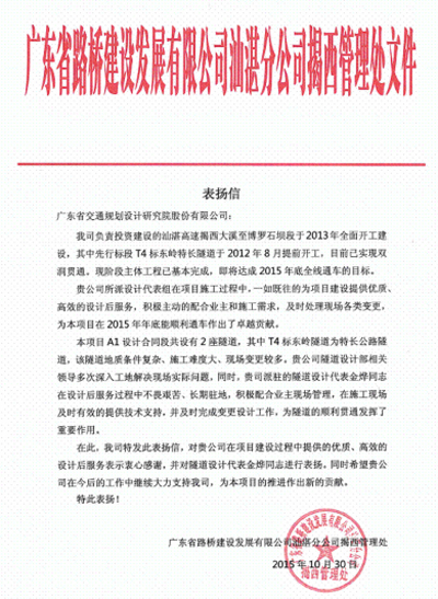 近日,廣東省路橋建設(shè)發(fā)展有限公司汕湛分公司揭西管理處發(fā)來表揚(yáng)信,對我司在汕湛高速揭西大溪至博羅石壩段中提供的專業(yè)、高效、優(yōu)質(zhì)服務(wù)表示贊揚(yáng),同時對負(fù)責(zé)該項目的隧道設(shè)計部派駐的隧道設(shè)計代表金燁同志給予了通報表揚(yáng)。目前該項目已基本完成主體工程,即將達(dá)成2015年底全線通車的目標(biāo)。