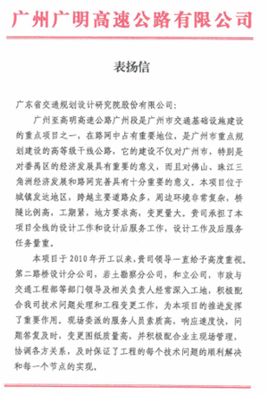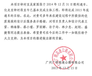 近日,廣州廣明高速公路有限公司發(fā)來表揚信,對我司在廣州至高明高速公路廣州段中提供的高效、優(yōu)質(zhì)服務(wù)表示贊揚,同時對負(fù)責(zé)該項目的第二路橋設(shè)計分公司等組織及個人給予了通報表揚。目前該項目鐘村至吳家圍段于2014年12月31日順利通車,化龍至鐘村段已基本完成主體工程,即將達(dá)成2015年底通車的目標(biāo)。