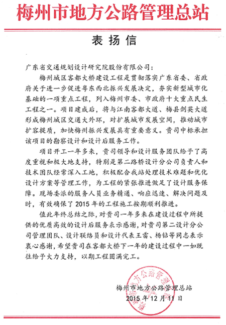 近日,梅州市地方公路管理總站發(fā)來(lái)表?yè)P(yáng)信,對(duì)我司在梅州城區(qū)客都大橋建設(shè)項(xiàng)目中提供的高效、優(yōu)質(zhì)服務(wù)表示贊揚(yáng),同時(shí)對(duì)負(fù)責(zé)該項(xiàng)目的第二路橋設(shè)計(jì)分公司及項(xiàng)目管理團(tuán)隊(duì)、設(shè)計(jì)聯(lián)絡(luò)員和設(shè)計(jì)代表王雷、楊鉆同志給予了通報(bào)表?yè)P(yáng)。特此報(bào)喜。