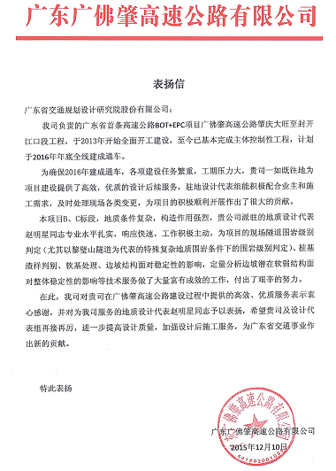 近日,廣東廣佛肇高速公路有限公司發(fā)來表揚信,對我司在廣佛肇高速公路肇慶大旺至封開江口段工程中提供的高效、優(yōu)質(zhì)的設計后服務表示贊揚,同時對負責該項目的巖土勘察分公司派駐的地質(zhì)設計代表趙明星同志給予了通報表揚。目前該項目已基本完成主體控制性工程,計劃于2016年年底全線建成通車。