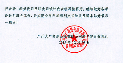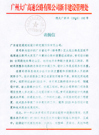 近日,廣州大廣高速公路有限公司新豐建設(shè)管理處發(fā)來表揚信,對我司在大廣高速粵境段連平至從化公路項目中提供的高效、優(yōu)質(zhì)的設(shè)計后服務表示贊揚,同時對負責該項目的第三路橋設(shè)計分公司、隧道設(shè)計部、巖土勘察分公司、交通工程部、和立公司,設(shè)計聯(lián)絡人李旭華、王成中及設(shè)計代表張樹春、甘林燦、楊寶峰、孟云龍、吳旭偉等組織及個人給予了肯定和表揚,特此報喜。目前,大廣高速粵境段已于2015年12月31日正式通車。