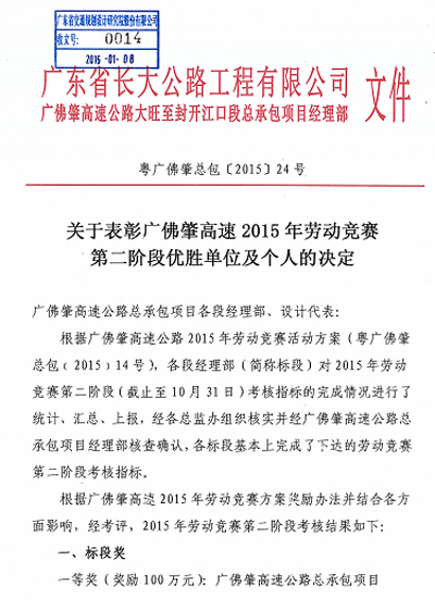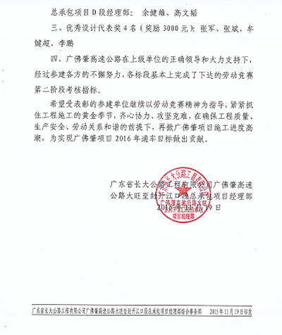 近日,我司第五路橋設(shè)計(jì)分公司駐廣佛肇高速公路大旺至封開江口段設(shè)計(jì)代表牟鍵超同志受到廣東省長(zhǎng)大公路工程有限公司廣佛肇高速公路大旺至封開江口段總承包項(xiàng)目經(jīng)理部表彰,榮獲廣佛肇高速2015年勞動(dòng)競(jìng)賽第二階段 “優(yōu)秀設(shè)計(jì)代表”稱號(hào)。特此報(bào)喜。