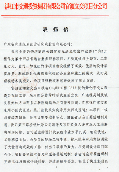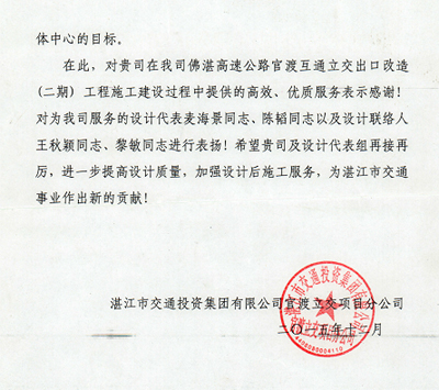 近日,湛江市交通投資集團(tuán)有限公司官渡立交項(xiàng)目分公司發(fā)來(lái)表?yè)P(yáng)信,對(duì)我司在佛湛高速公路官渡互通立交出口改造(二期)工程項(xiàng)目中提供的高效、優(yōu)質(zhì)的設(shè)計(jì)后服務(wù)表示贊揚(yáng),同進(jìn)對(duì)負(fù)責(zé)該項(xiàng)目的第三路橋設(shè)計(jì)分公司設(shè)計(jì)代表麥海景同志、陳韜同志以及設(shè)計(jì)聯(lián)絡(luò)人王秋穎同志、黎敏同志給予了肯定和表?yè)P(yáng),特此報(bào)喜。