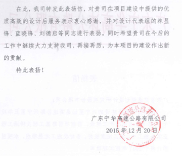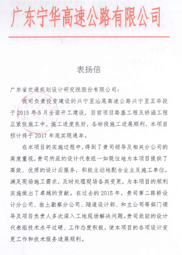 近日,廣東寧華高速公路有限公司發(fā)來表揚(yáng)信,對我司在興寧市至汕尾高速公路興寧至五華段項(xiàng)目中提供的優(yōu)質(zhì)、高效的設(shè)計(jì)后服務(wù)表示贊揚(yáng),同時(shí)對負(fù)責(zé)該項(xiàng)目的第二路橋設(shè)計(jì)分公司等組織和個(gè)人給予了通報(bào)表揚(yáng)。特此報(bào)喜。