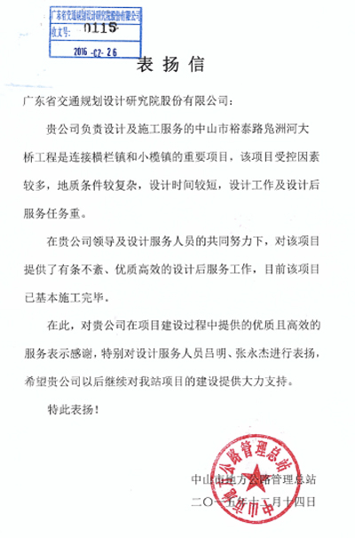 近日,中山市地方公路管理總站發(fā)來(lái)表?yè)P(yáng)信,對(duì)我司在中山市裕泰路鳧洲河大橋工程中提供的高效、優(yōu)質(zhì)的設(shè)計(jì)后服務(wù)表示贊揚(yáng),同時(shí)該項(xiàng)目所屬的第一路橋設(shè)計(jì)分公司及設(shè)計(jì)代表呂明、張永杰等個(gè)人給予了通報(bào)表?yè)P(yáng)。特此報(bào)喜。