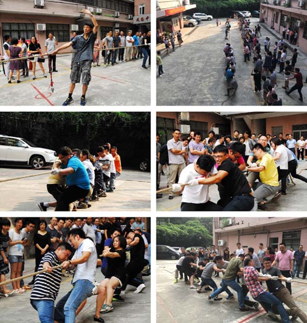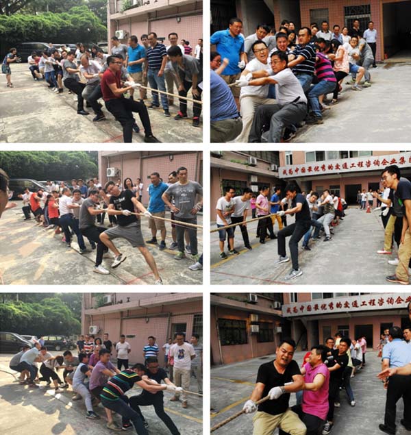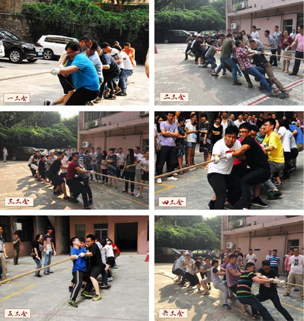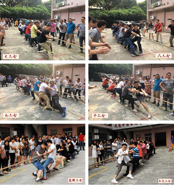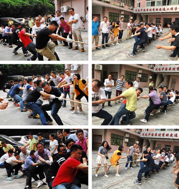 在現(xiàn)場(chǎng)的陣陣喝彩聲中比賽的哨聲響起。參賽的隊(duì)員們都緊握長繩卯足了勁拼命往后拉,場(chǎng)邊未參賽的員工也自發(fā)組成啦啦隊(duì)為場(chǎng)上的隊(duì)員們吶喊助威,“一…二…加油!”的口號(hào)聲此起彼伏,高亢有力。各小組都派出了最強(qiáng)的比賽陣容,上下一心,劍指冠軍。每一次的勝負(fù),都需經(jīng)過幾番力量與士氣的角逐才能見分曉,現(xiàn)場(chǎng)激烈的比賽高潮迭起。