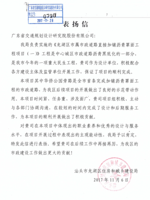 近日,汕頭市龍湖區(qū)住房和城鄉(xiāng)建設(shè)局發(fā)來表?yè)P(yáng)信,對(duì)我司在龍湖區(qū)市屬市政道路直接加鋪瀝青罩面工程項(xiàng)目(一)中提供的優(yōu)質(zhì)、高效的設(shè)計(jì)及后服務(wù)表示感謝,對(duì)負(fù)責(zé)此次項(xiàng)目的市政設(shè)計(jì)分公司及項(xiàng)目團(tuán)隊(duì)給予了充分肯定,特此報(bào)喜!