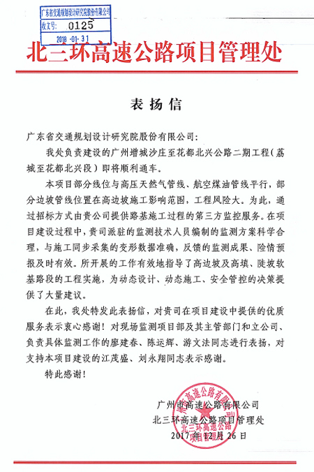 近日,北三環(huán)高速公路項目管理處發(fā)來表揚信,對我司在廣州增城沙莊至花都北興公路二期工程(荔城至花都北興段)項目中提供優(yōu)質服務表示肯定,對負責該項目的和立公司及其相關負責人江茂盛、劉永翔,技術人員廖建春、陳運輝、游文法給予了通報表揚,特此報喜!
