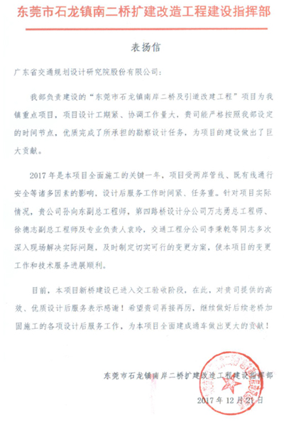 近日,東莞市石龍鎮(zhèn)南岸二橋擴建改造工程建設指揮部發(fā)來表揚信,對我司在東莞市石龍鎮(zhèn)南岸二橋及引道改建工程項目中提供優(yōu)質的勘察設計及服務質量表示滿意和肯定,對負責該項目的相關部門和相關負責人、設計服務人員給予了充分肯定,特此報喜!