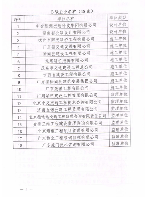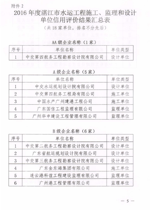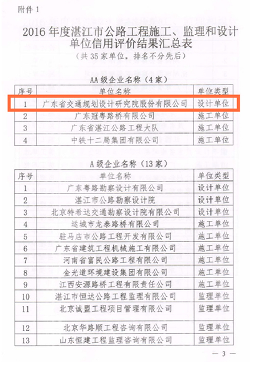 近日,湛江市交通運輸局公布了2016年度湛江市公路水運工程從業(yè)單位信用評價結果。我公司榮獲2016年度湛江市公路工程施工、監(jiān)理和設計單位信用評價AA級企業(yè)。 信用評價是企業(yè)履行質量承諾能力的證明,是企業(yè)對外經(jīng)營的有效“通行證”。此次評價進一步反映了我公司的設計質量得到了市場認可。