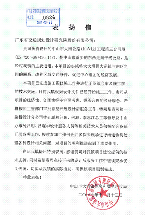 近日,中山市大涌鎮(zhèn)住房和城鄉(xiāng)建設局發(fā)來表揚信,對我司在中山市大南公路(加六線)工程第三合同段中提供優(yōu)質的設計后服務表示肯定,對負責該項目的第一路橋設計分公司相關負責人林延鵬、何海、李志江,及中山辦事處服務人員呂明、呂耀華給予了通報表揚,特此報喜!