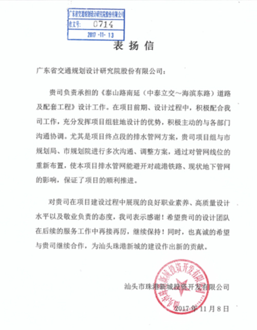 近日,汕頭市珠港新城投資開發(fā)有限公司發(fā)來表揚(yáng)信,對我司在泰山路南延(中泰立交—海濱東路)道路及配套工程項目中提供的優(yōu)質(zhì)、高效、全面的設(shè)計及后服務(wù)表示感謝,對負(fù)責(zé)此次項目的市政設(shè)計分公司及項目團(tuán)隊給予了充分肯定,特此報喜!