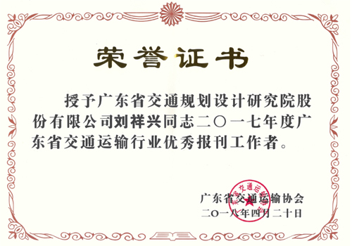 我公司報刊《廣東交通規(guī)劃設(shè)計》被廣東省交通運輸協(xié)會評為2017年度廣東省交通運輸行業(yè)優(yōu)秀報刊,技術(shù)質(zhì)量部劉祥興副主任被評為2017年度廣東省交通運輸行業(yè)優(yōu)秀報刊工作者。特此報喜!