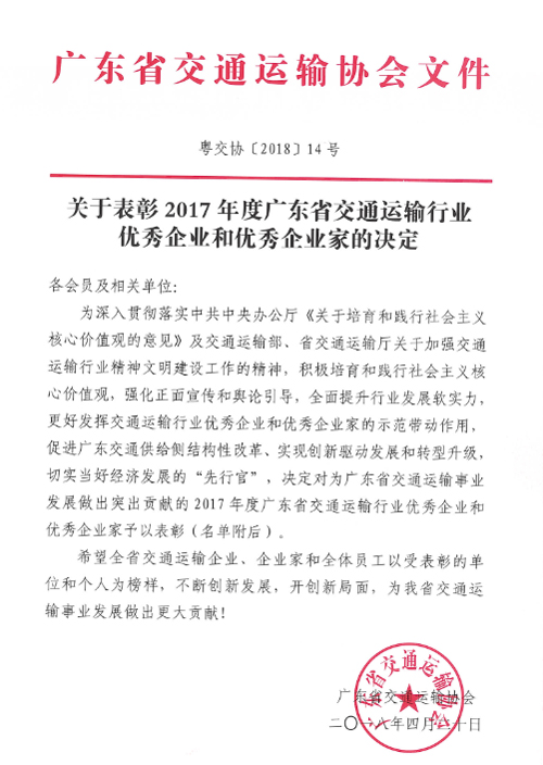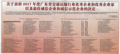 4月20日,廣東省交通運輸協(xié)會表彰了2017年度廣東省交通運輸行業(yè)優(yōu)秀企業(yè)。經(jīng)專家審定,我公司榮獲廣東省交通運輸行業(yè)優(yōu)秀企業(yè)。特此報喜!