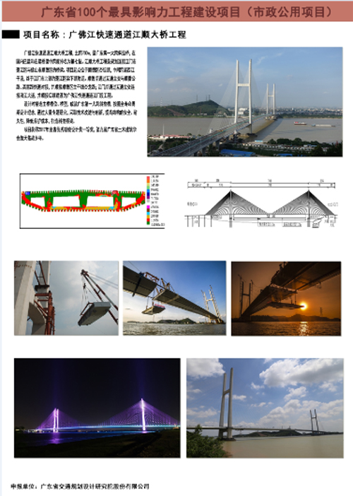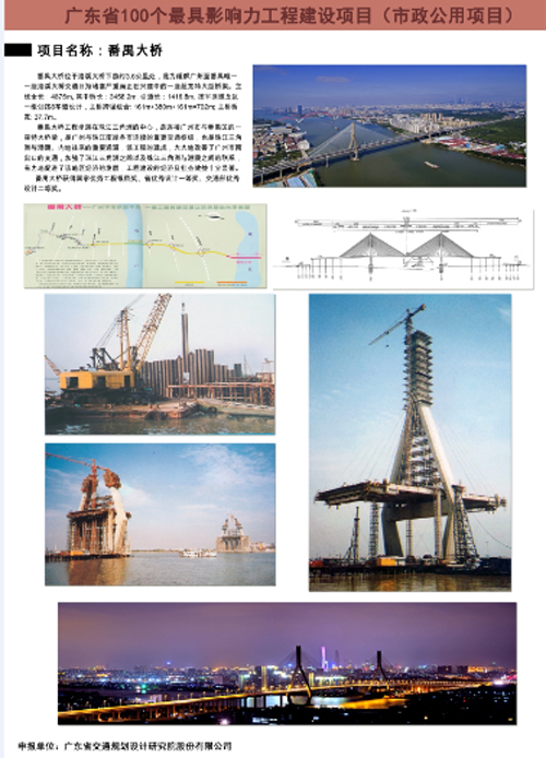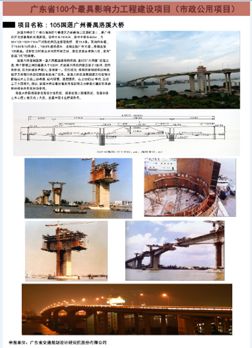 此外,由公司設(shè)計的“105國道廣州番禺洛溪大橋工程”、“番禺大橋工程”、“廣佛江快速通道江順大橋工程”和“廣東省西部沿海高速公路崖門大橋工程”榮獲廣東省勘察設(shè)計行業(yè)100個最具影響力工程建設(shè)項目稱號。