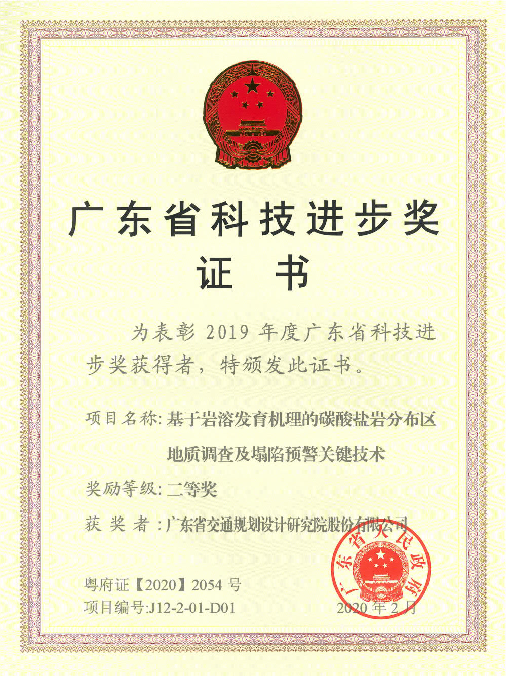 2.“基于巖溶發(fā)育機理的碳酸鹽巖分布區(qū)地質調查及塌陷預警關鍵技術”榮獲廣東省科技進步二等獎,承擔部門為巖土勘察分院。