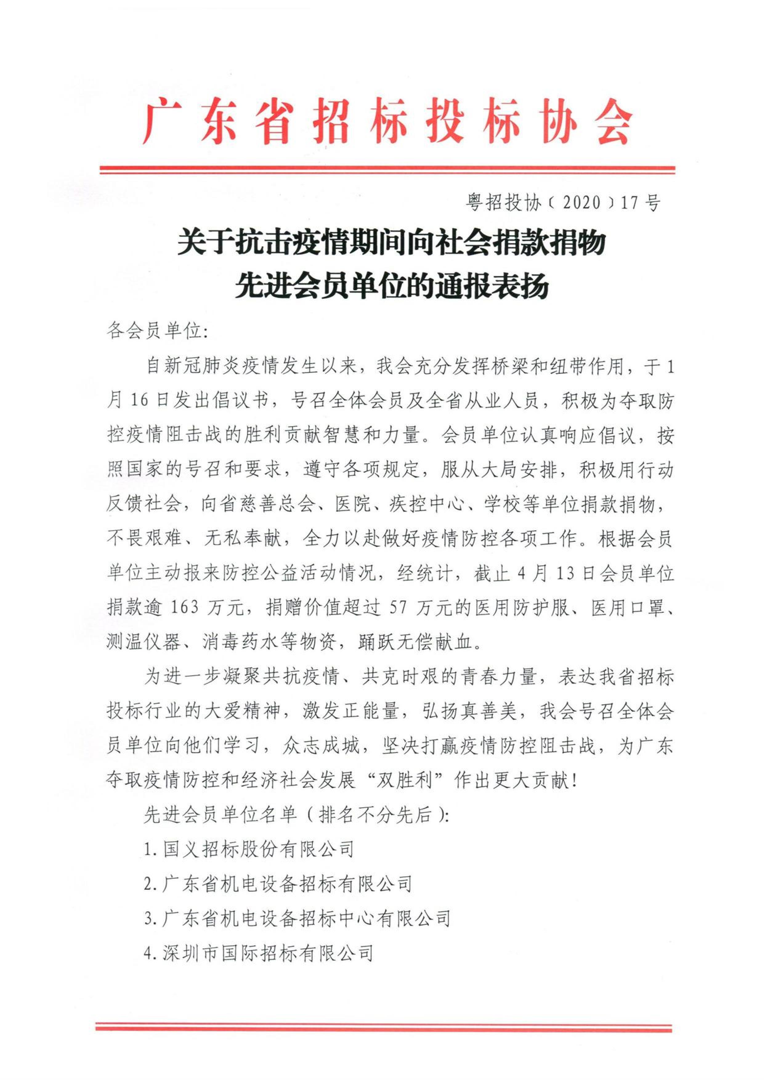 近日,我公司及員工在抗擊疫情期間踴躍捐款、獻(xiàn)血奉獻(xiàn)愛心,積極用行動(dòng)為抗疫貢獻(xiàn)力量,公司獲得了廣東省招標(biāo)投標(biāo)協(xié)會(huì)的通報(bào)表揚(yáng)。